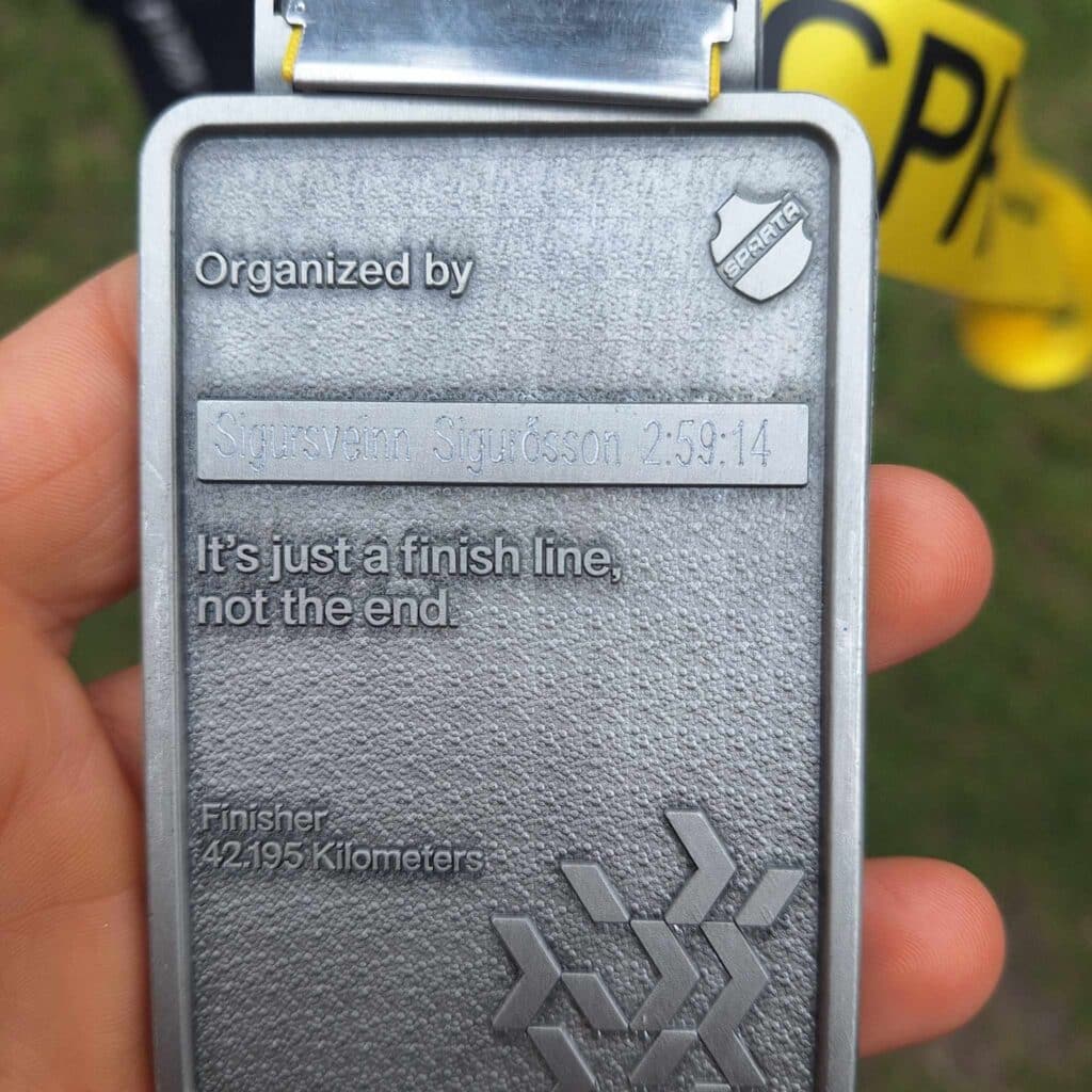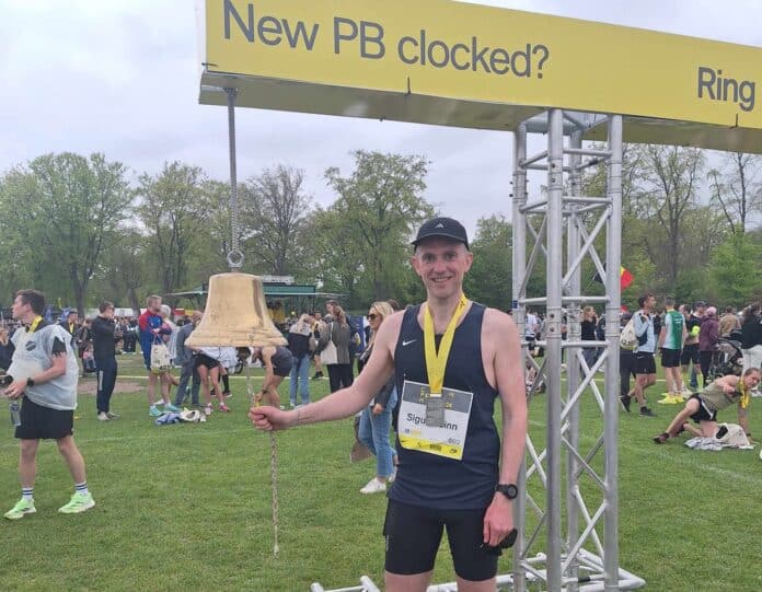 Sigursveinn tók þátt í Kaupmannahafnarmaraþoninu á sunnudaginn og kom í mark á tímanum 2:59,14. Hann bætti þar með héraðsmetið í karlaflokki um rétt rúmar tvær mínútur en fyrra met setti Valdimar Bjarnason, Þór Þ, í Amsterdam árið 2012.