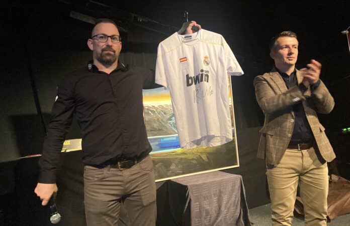 Á herrakvöldinu er meðal annars haldið uppboð á listmunum og fleira til styrktar knattspyrnudeildinni en meðal hluta sem boðnir voru upp í gær var Real Madrid treyja, árituð af engum öðrum en knattspyrnugoðinu Cristiano Ronaldo.