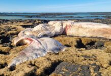 Hval hefur rekið á land skammt frá Skipum, austan við Stokkseyri. Líklegast er um...