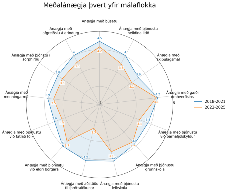 Þegar svör íbúa eru greind eftir kjörtímabilum og meðaltal reiknað fyrir hvern málaflokk kemur í ljós að ánægja íbúa er að jafnaði lægri á kjörtímabilinu 2022–2025 en hún var á tímabilinu 2018–2021.