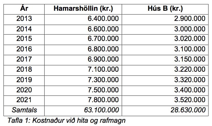 Eins og glögglega má sjá þá er rekstrarkostnaður vegna hita og rafmagns umtalsvert hærri á Hamarshöllinni heldur en húsi B. Samantekinn kostnaður yfir árin 2013 – 2021 (9 ár) er kr. 34.470.000.- meiri fyrir Hamarshöllina heldur en hús B.