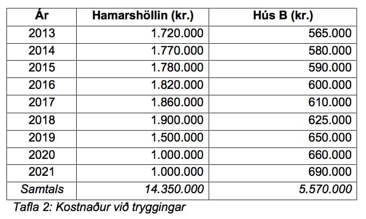 Hér að ofan sést að tryggingarkostnaður við Hamarshöllina er umtalsvert hærri en á húsi B. Samantekinn kostnaður yfir árin 2013 – 2021 (9 ár) er kr. 8.780.000.- meiri fyrir Hamarshöllina heldur en hús B