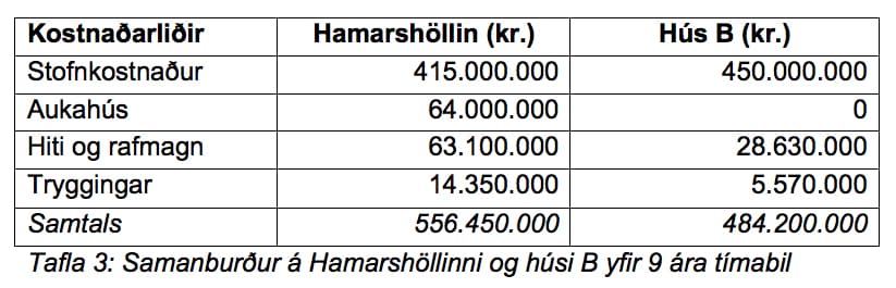 Ég komst yfir upplýsingar um kostnað á fjölnotaíþróttahúsi í Grindavík, en það hús er einangrað með staðsteyptum veggjum og stálgrindarþaki. Inn í húsinu er knattspyrnuvöllur og 60m löng hlaupabraut. Húsið var byggt árið 2009 og var stofnkostnaður þess 281 m.kr. m/vsk. Hús þetta er 3653fm og er því fermetra verðið samtals 76.923.- m/vsk. Ég framreikna þennan kostnað til ársins 2012 miðað við vísitölu og er því áætlað fermetra verð árið 2012 89.838.- m/vsk. Miðað við 5.000fm hús (hús B) á þessu fermetra verði hefði það hús kostað 450 m.kr. Í töflu 3 má sjá samanburð á Hamarshöllinni og húsi B miðað við framangreindar forsendur, þ.e. stofnkostnað og rekstrarkostnað við hita og rafmagn annars vegar og tryggingar hins vegar yfir níu ára tímabil í jafnstórum húsum (5.000 fm).