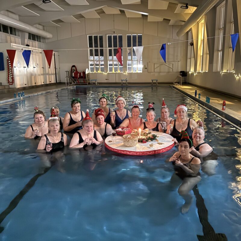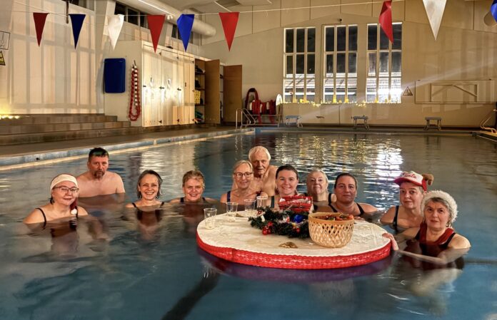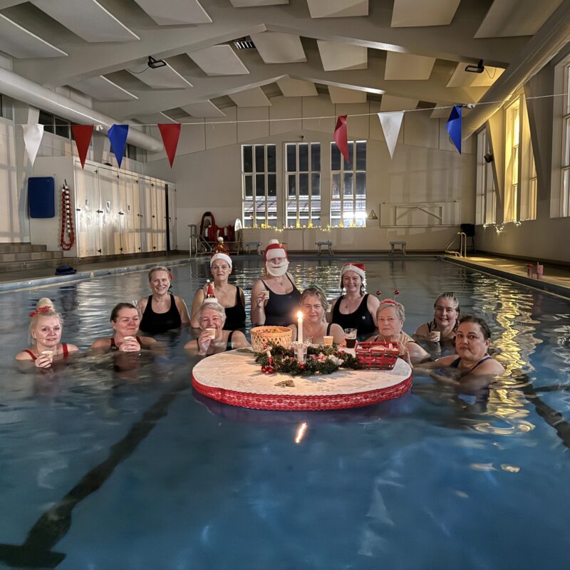 Það var sannkölluð hátíðarstemning í Sundhöll Selfoss í byrjun desember þegar Vatn og heilsa hélt árlega jólatíma sína. Allir iðkendur voru hvattir til að mæta í jólalegum múnderingum og létu þau það ekki á sig standa. Það mátti sjá ótal skrautleg höfuðföt og skart hjá iðkendum sem tóku þátt í fjörugri vantsleikfimi sem skilaði bæði gleði og góðri hreyfingu.