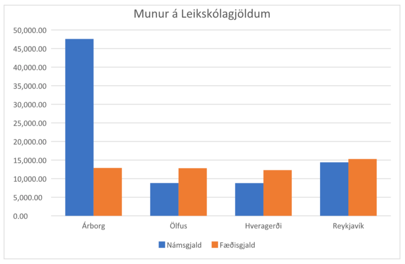 Það blasir því við að mun dýrara er að hafa börn í vistun á leikskólum í sveitarfélaginu okkar, en það munar um 179,5 % á Leikskólagjöldum í Ölfus og Árborg á ári. Milli Árborgar og Hveragerðis munar 186,6% á leikskólagjöldum og á hvorugum þessum stað eru skráningardagar svo foreldrar geta nýtt sér 40 klukkustunda vistun. Í Árborg og Reykjavík eru skráningardagar en það munar þó 103,7 % á leikskólagjöldum.