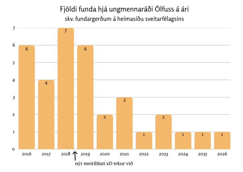 Hér fyrir neðan höfum við frekar skýra mynd sem sýnir fjölda þeirra funda sem ungmennaráð Ölfuss hefur haldið frá árinu 2016. Samkvæmt samþykktum sveitarfélagsins Ölfuss er ungmennaráð til ráðgjafar fyrir bæjarstjórn um málefni ungs fólks í sveitarfélaginu skv. 2. mgr. 11. gr. æskulýðslaga nr. 70/2007. Ráðið starfar samkvæmt erindisbréfi sem er reyndar ekki að finna á vef sveitarfélagsins að okkur sýnist.