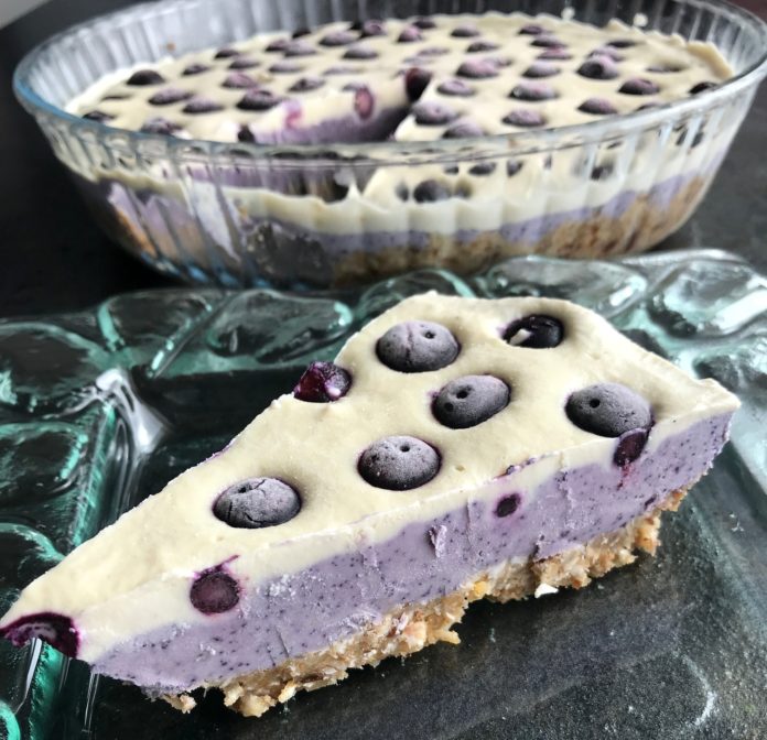 - Hellið bláberjablöndunni yfir valhnetubotninn, dreifið vel úr með sleikju og setjið inn í frysti í sirka klukkutíma.