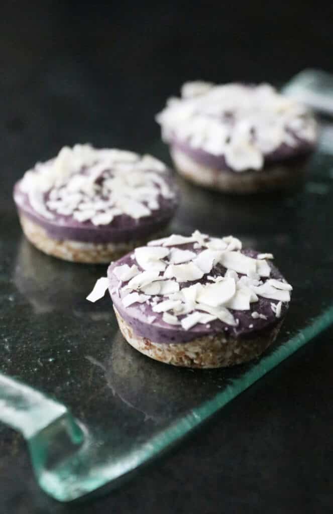 Þetta er heldur ekki stór uppskrift svo að fólk þarf ekki að fara á hausinn við að kaupa hráefnið í hana. Það er líka ótrúlega svekkjandi að vera búinn að gera stóra hrákökuuppskrift sem er maður er svo ekkert að fíla á endanum. En ég vona samt að þið fílið þessar raw bláberjamuffins – að minnsta kosti hafa allir sem hafa smakka þær verið mjög ánægðir með þær enda eru þær bæði hollar og góðar.