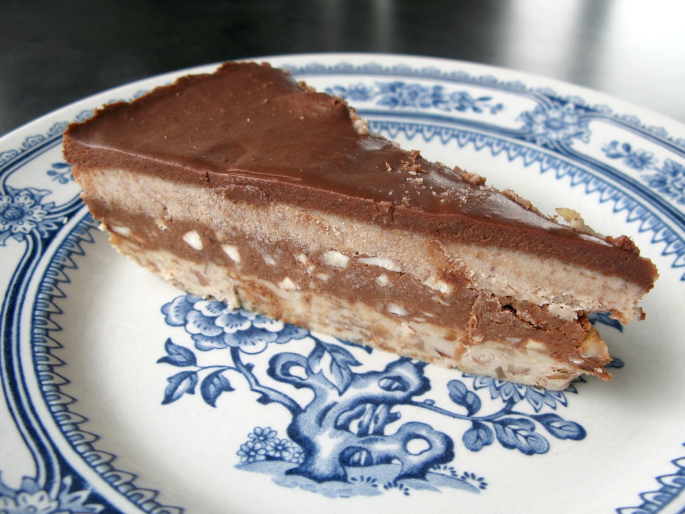 Blandið öllu vel saman, líka hnetunum, í matvinnsluvél, með töfrasprota eða í blandara. Smyrjið ofan á 2. lagið og setjið mótið aftur inn í frysti.