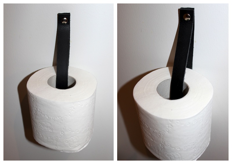 Klippið eða skerið eina eða fleiri lengjur í stærðinni 44 cm. Gatið beltið ca 1 cm frá efri brún, leggið beltið saman og gatið aftur í gegnum sama gatið til að fá samstætt gat. Setjið smelluna á beltið og gatið með beltagataranum 1 gat fyrir neðan smelluna sem fer upp að veggnum. Passið að gata ekki báðu megin í þessu tilfelli. Skrúfan er sett í þetta gat til að festa við vegginn. Salernisrúllan sett í gegnum beltið og smellunni lokað.