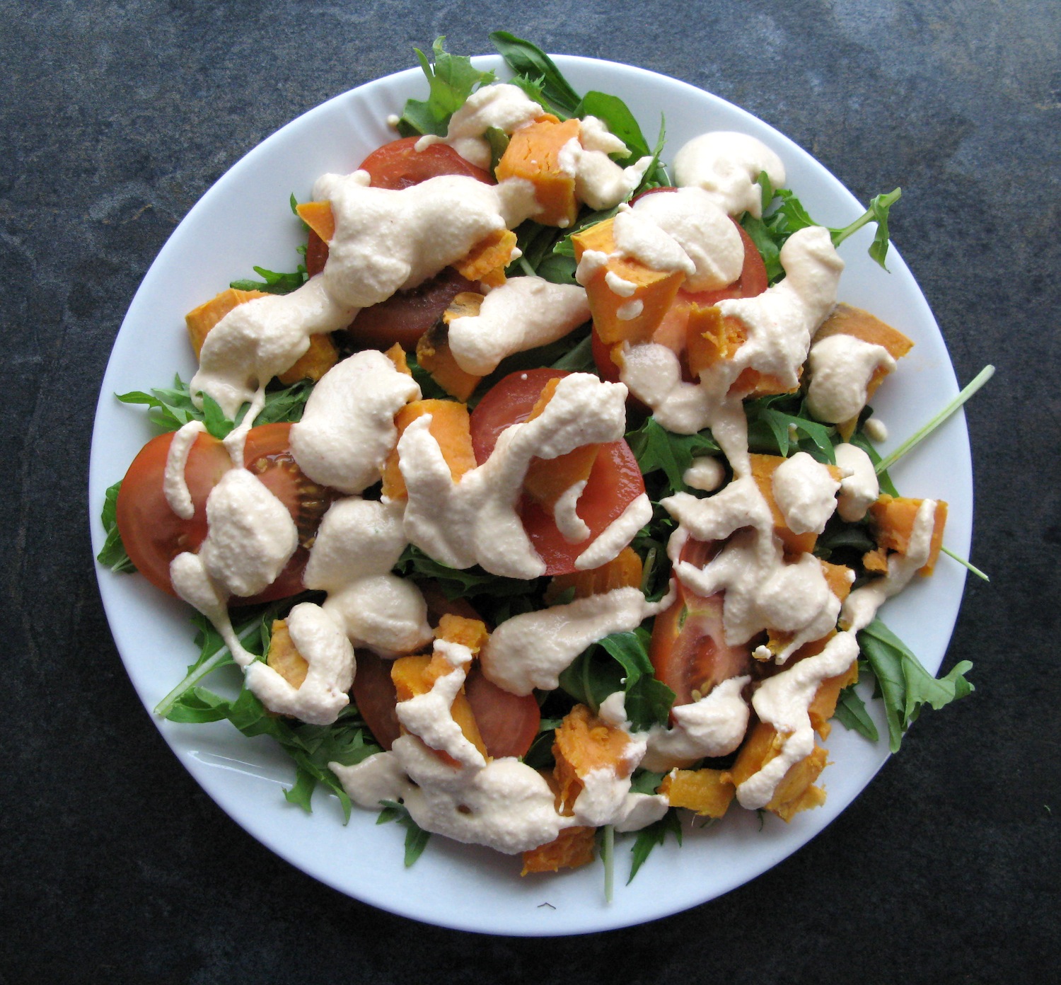 Sósuna nota ég yfir grænmeti bæði ferskt og eldað. Oftast geri ég blöndu af báðu – bæði ferskt salat og svo kannski bakaðar sætar kartöflur og annað með á diskinum. Og svo kasjúhnetusósuna yfir allt. Unaðslega gott!