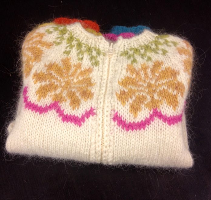 Gallinn er prjónaður úr tvöföldum plötulopa frá Ístex. Aðalliturinn er hvítur en sumarlitirnir gefa gallanum svo sannarlega lit.