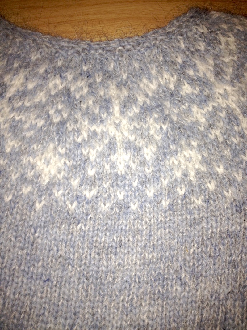 Mitt framlag til Óveðurspeysunnar var peysan Bylur. Ég valdi liti sem mér fannst lýsandi fyrir dimma daga og snjóbyl, sanna íslenska veðráttu. Því valdi ég að hafa fölbláan aðallit og gráhvítan sem mynsturlit. Peysan mín er prjónuð úr einföldum plötulopa og einbandi úr öðrum lit til að fá örlítið úfið yfirbragð. Ég gaf peysunni vinnuheitið „Winter wonderland“ svo hún ber með sér rómantískan blæ með snjókornunum. Þrátt fyrir það er óblíð veðráttan ekki langt undan, enda snjóbylur í mynstrinu.