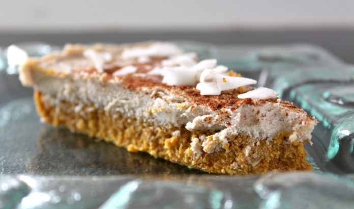 Blandið kasjúhnetunum, vatninu, hunanginu, vanillunni, sítrónusafanum, sjávarsaltinu og kókosolíunni vel saman í matvinnsluvél, með töfrasprota eða í blandara. Þegar blandan er orðin silkimjúk hellið henni þá yfir botninn og dreifið vel úr. Skreytið með kanil og kókosflögum. Setjið inn í frysti í nokkrar klukkustundir. Ath. Ef kakan er búin að vera lengi í frystinum þá þarf hún að fá að þiðna í sirka 2 klst áður en hún er borðuð. Annars er eins og þið séuð að borða gulrótaís. Hún er svo miklu betri þegar hún er orðin svolítið mjúk og diskarnir ekki í hættu þegar þið reynið að skera ykkur bita með skeiðinni 🙂
