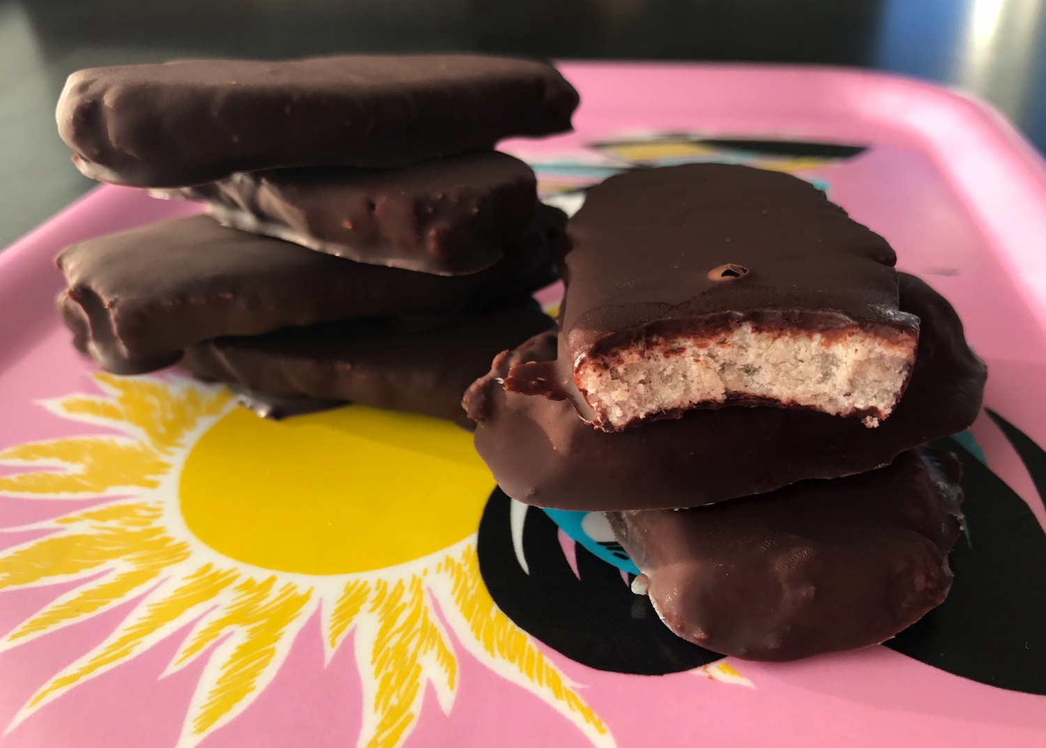 - Setjið bakkann með bitunum aftur inn í frysti og geymið í nokkrar klukkustundir (2 klst er fínt – 4 klst enn betra) svo að súkkulaðið nái að harðna almennilega.
