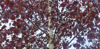Beinvaxið hvítstofna birki með blöð sem minna á rauðar jólakúlur