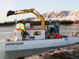 Siglt með tæki og búnað út í Efri-Laugardælaeyju
