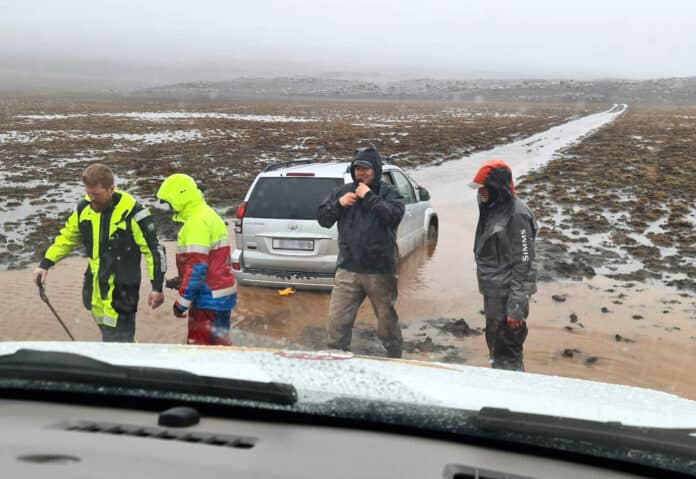 Annar jeppi var fastur í aur þar skammt frá, og var sá bíll einnig dreginn upp. Þriðji bíllinn var í vandræðum á svæðinu og þegar hann var orðinn laus hélt björgunarsveitarfólk til byggða.