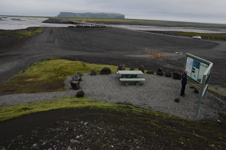 Upplýsingaskilti um flóðið í Múlakvísl í júlí í fyrra og hvernig brú var byggð á sjö dögum var sett upp við ána fyrr í sumar.