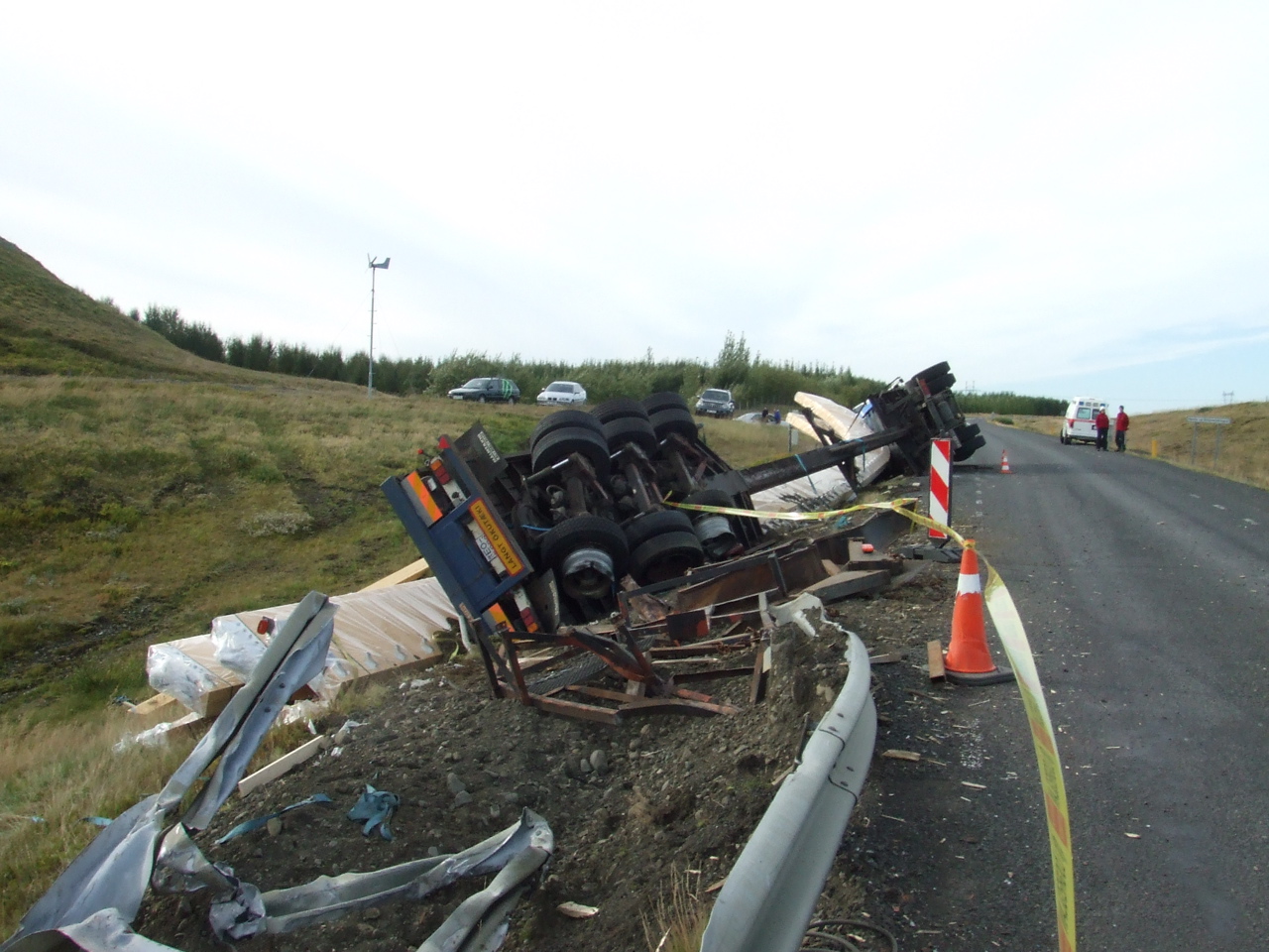 Talið er að afturhjól eftirvagns vörubílsins sem valt við Stóru-Laxá á laugardag hafi lent á brúarhandriðinu við enda brúarinnar og við það hafi vagninn oltið og tekið bílinn með sér.