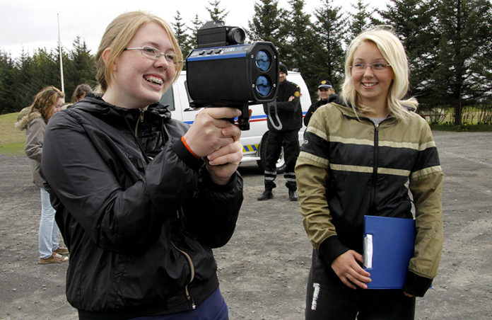 Ellefu stúlkur úr 10. bekk Vallaskóla voru í starfskynningu hjá Lögreglunni á Selfossi í dag og mældu meðal annars ökuhraða á Engjaveginum.