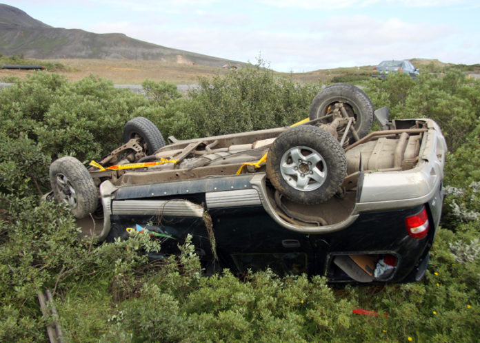 Bíllinn fór útaf veginum í krappri hægri beygju og hafnaði á hvolfi ofan í grunnu gili.