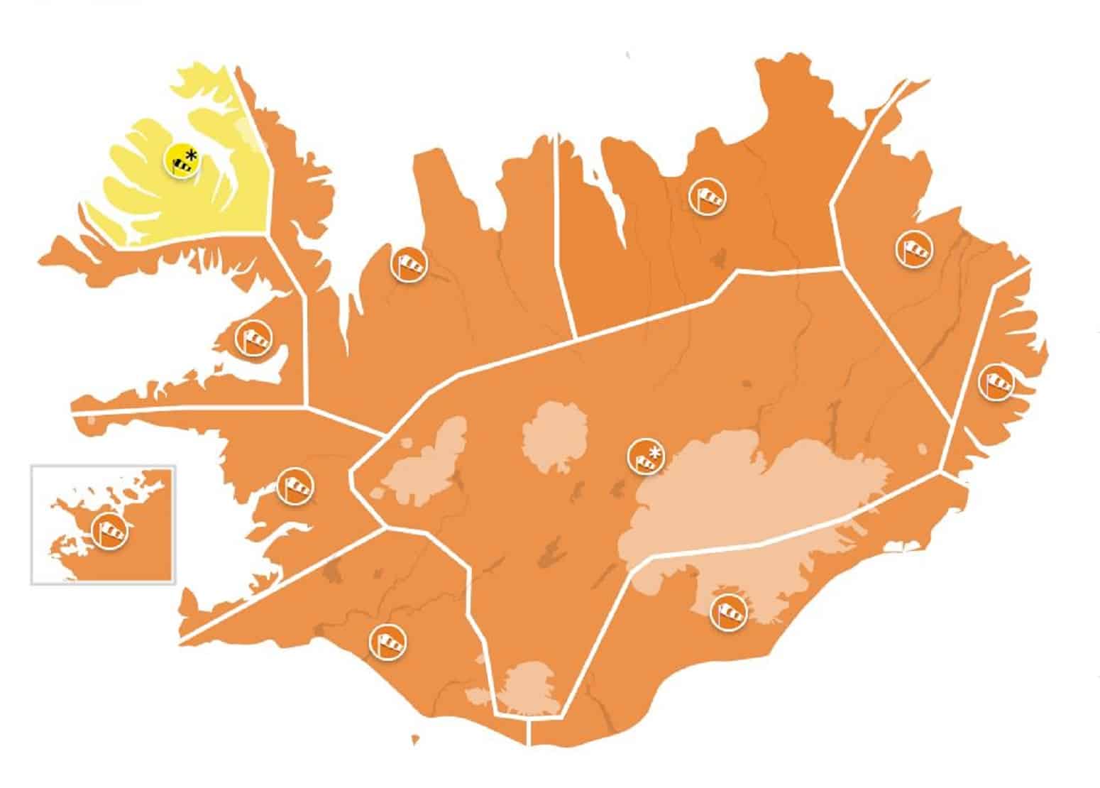 Á Suðurlandi verður sunnanátt, 20-28 m/sek og vindhviður staðbundið yfir 40 m/sek á meðan viðvörunin er í gildi.