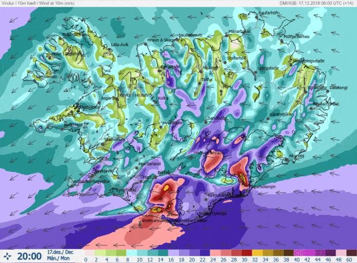 Á suðausturlandi tekur gul viðvörun gildi kl. 17:30 til kl. 23:00 en í Öræfum er búist við sama austanhvassviðri eða stormi og vindhviðum allt að 40 m/sek.