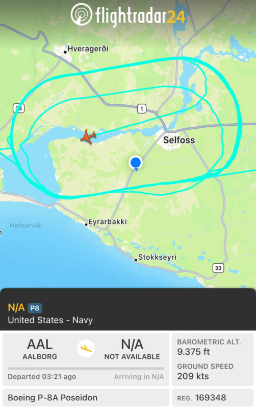 Flugvél frá bandaríska sjóhernum hefur undanfarna klukkustund hringsólað í kringum Selfoss. Fleiri herflugvélar hafa verið á flugi yfir Suðurlandi í morgun.