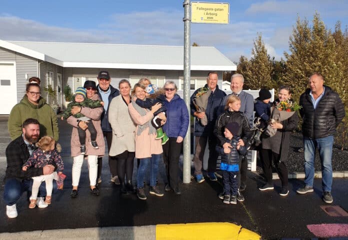Viðurkenningin var afhent síðastliðinn fimmtudag en Eggert Valur Guðmundsson, formaður bæjarráðs og Gísli Halldór Halldórsson, bæjarstjóri, afhjúpuðu þá skilti við götuna ásamt nokkrum af íbúum hennar.