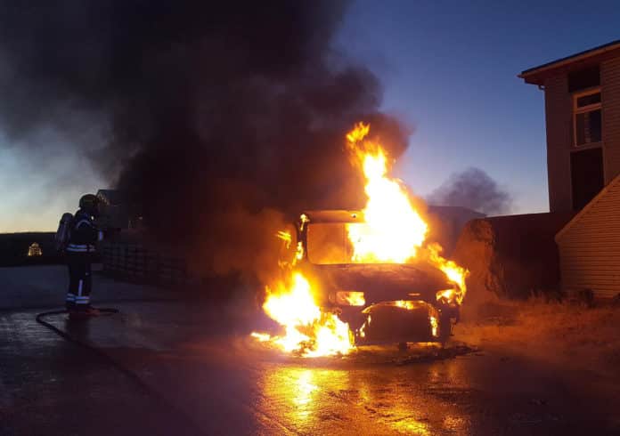 Neyðarlínan fékk tilkynningu um alelda bifreið við Háeyrarvelli á Eyrarbakka og höfðu Brunavarnir Árnessýslu töluvert viðbragð vegna eldsins en að sögn Péturs Péturssonar, slökkviliðsstjóra, var í upphafi talið að hús sem bíllinn stóð uppvið væri í hættu en svo reyndist ekki vera.