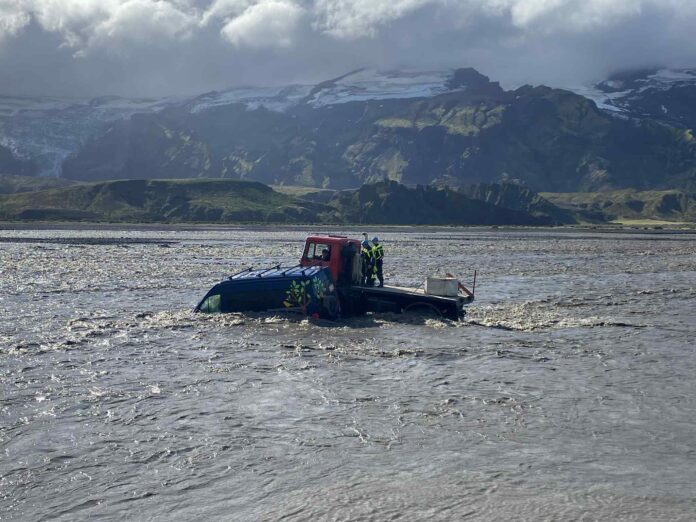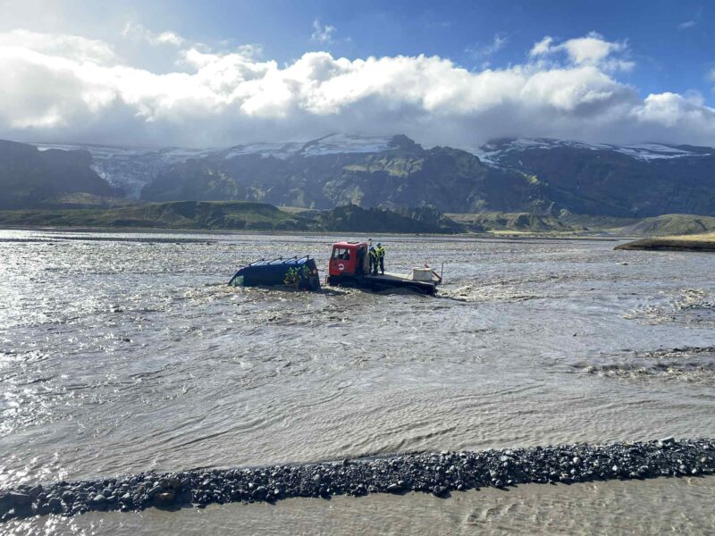 Björgunarfólk fór á mesta forgangi inn Emstruleið og þegar þau komu á staðinn var vörubíl björgunarsveitar ekið út í ána og fólkinu bjargað úr bílnum og flutt í land. Aðstæður voru þannig að ekki var talið óhætt að reyna að koma bílnum upp úr ánni á þeim tímapunkti.