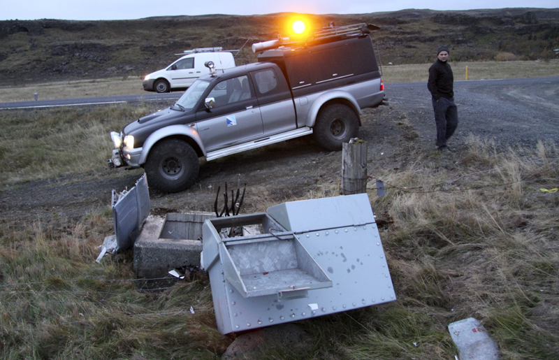 Starfsmenn RARIK eru að ljúka við viðgerð en þeim tókst fljótlega að koma rafmagni á norðurhluta svæðisins. Straumlaust var sunnan slysstaðarins, að Hrauni fram eftir kvöldi.