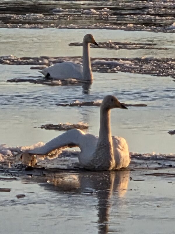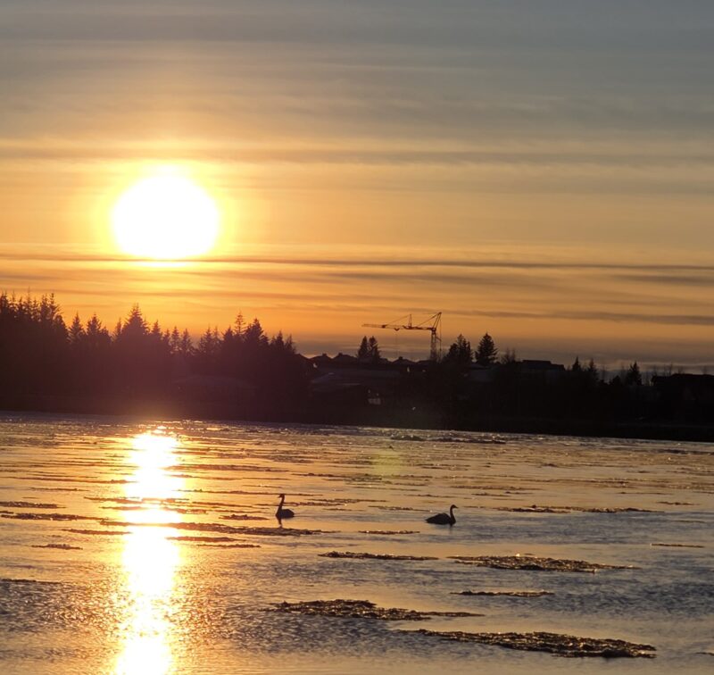 „Það kom auðvitað styggð að álftinni við þetta og rétt áður en við komum að henni þá náði hún að slíta sig lausa. Maki álftarinnar fylgdist með aðgerðunum úr seilingarfjarlægð og syntu þær síðan saman út í sólarlagið, þannig að þetta fallega ævintýri hafði farsælan endi,“ bætti Pétur við.