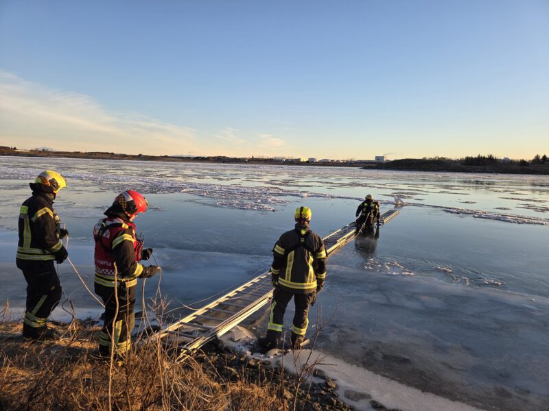 Það kom þó ekki til kasta björgunarsveitarinnar því ísinn var traustur og slökkviliðsmennirnir voru fljótir að henda stiga út á hann. Bundnir í línu og klæddir björgunarvesti nálguðust þeir fuglinn.