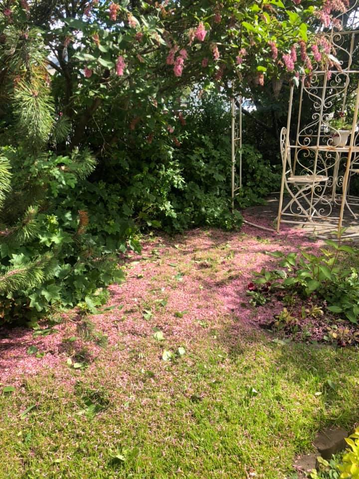 Sírenurnar, sem hafa verið einstaklega fallegar í sumar eftir gott síðasta sumar, hafa misst blómin í stórum stíl sem hefur gert það að verkum að sums staðar á Selfossi hefur snjóað bleiku eins og myndin sem fylgir fréttinni ber með sér.