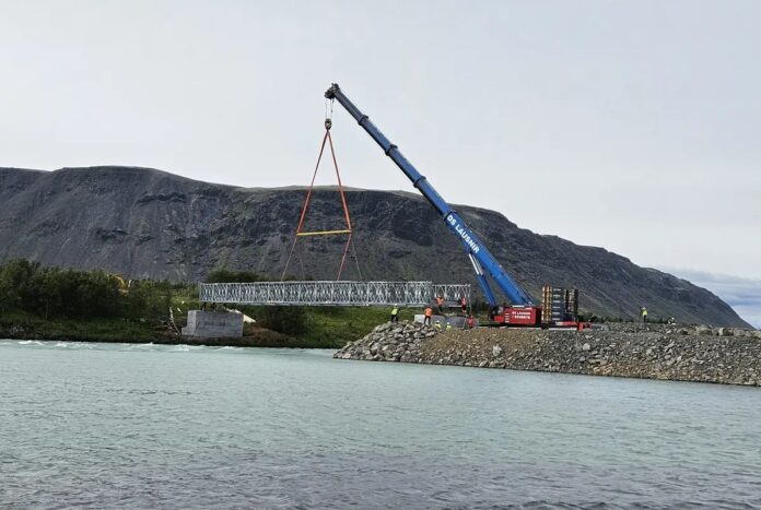Brúin er frá fyrirtækinu Acrow á Bretlandi og er sömu gerðar og nýja færanlega göngu- og hjólabrúin yfir Sæbraut í Reykjavík. Hún kom ósamsett til landsins og það tók fimm menn tvo daga að setja hana saman, sem var tveimur dögum fljótar en framleiðandinn gerði ráð fyrir. Brúin var 44 tonn þegar hún var hífð af krananum en þegar búið verður að leggja brúargólf verður hún 68 tonn.