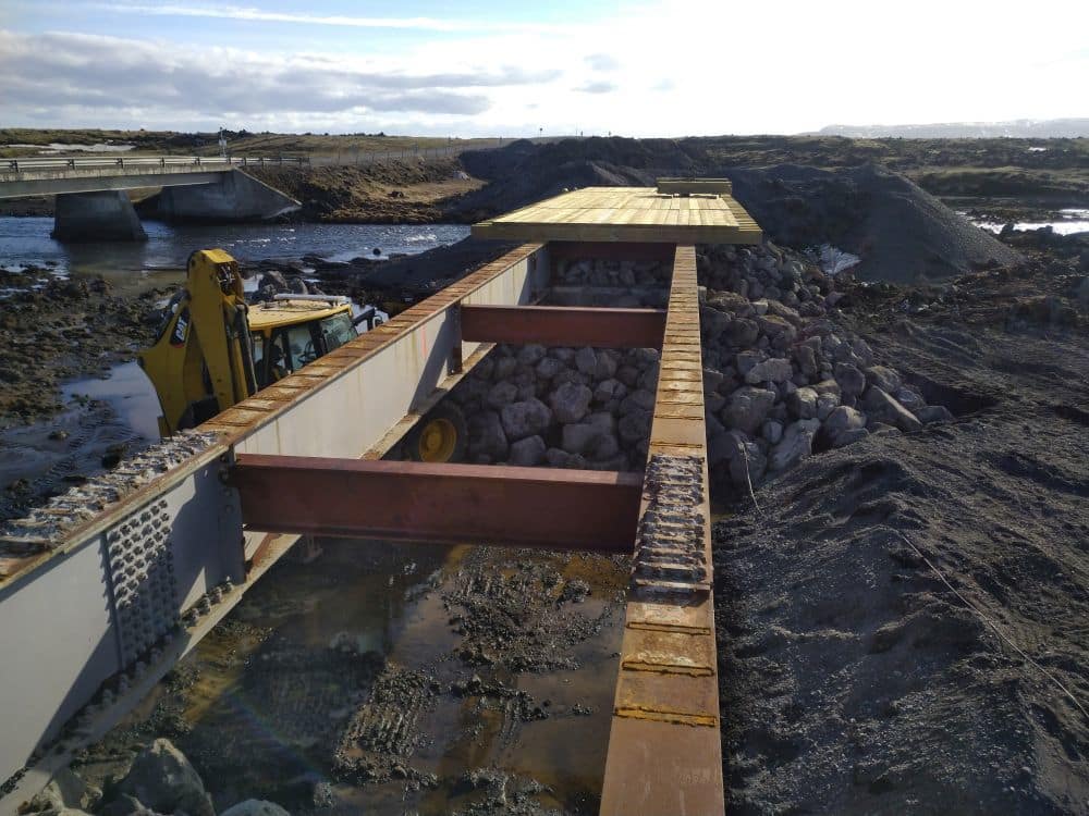 Smíði bráðabirgðarbrúarinnar er langt komin. Hún hófst með því að brúarvinnuflokkurinn smíðaði átta timburfleka, 4m x 4m að stærð, á Selfossi. Þegar undirstöður voru tilbúnar á staðnum var farið að setja upp stálbita og gólfeiningar sem flekunum var síðan raðað ofan á. Enn á eftir að ganga frá vegriði á brúna og tengja veginn við hana, en sú vinna klárast í næstu viku.