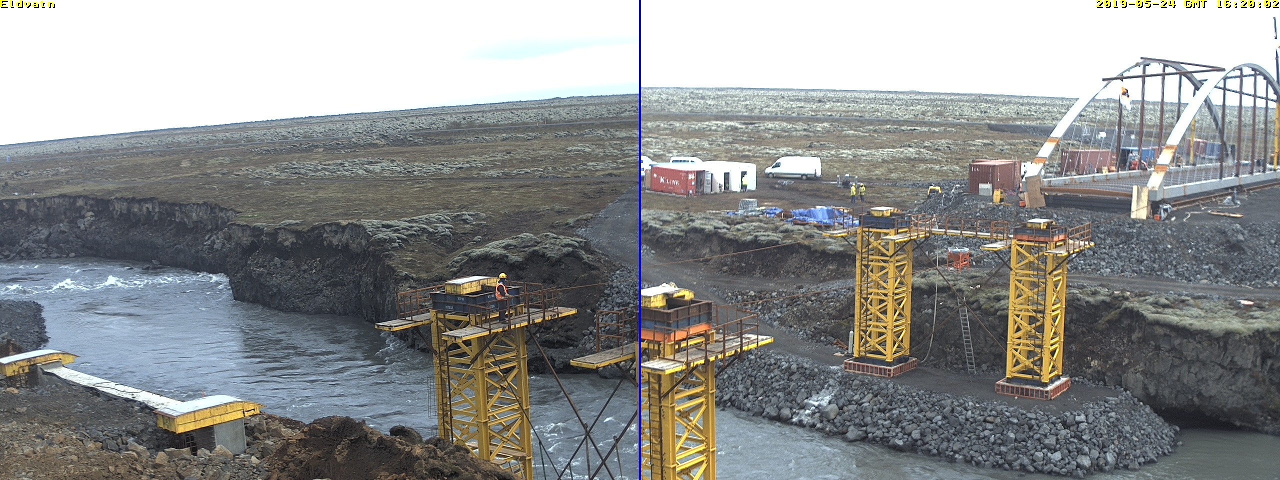 Á föstudag hófst vinna við að draga burðarvirkið yfir ána en verkinu mun ljúka á sunnudaginn. Notuð er sú aðferð að burðarvirki brúarinnar er ýtt yfir ána með vökvatjökkum. Enn er töluverð vinna eftir en áætlað er að vegurinn að brúnni verði opnaður í september.