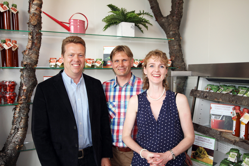 Í framhaldi af því var ákveðið að útbúa matarminjagripi, útlitsgallaða vöru og búa til úr henni vörulínu, svo sem tómatdrykki, sósur, salsa, sultu og fleira úr afurðinni. „Við vildum bjóða gestum okkar að taka með svona matarminjagrip og því hefur þessi verslun verið opnuð,“ segir Knútur.