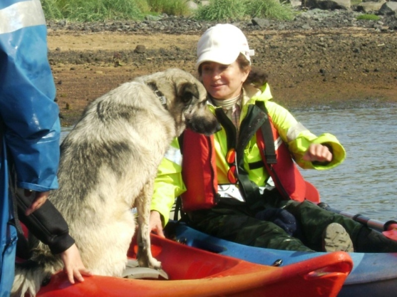 Þegar í land var komið hafði Dorrit á orði að henni hefði alltaf langað að kenna Sámi að synda. Hún tók hann því með sér út á kajak og reri spölkorn frá landi og eftir andartak var Sámur kominn á sund.