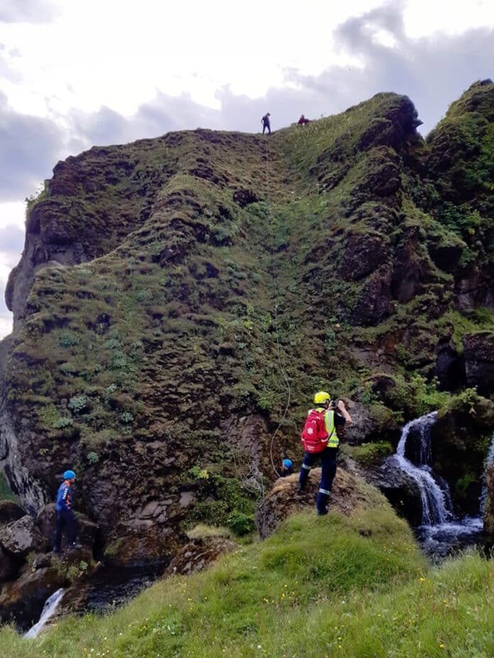 Björgunarsveitafólk kom honum til aðstoðar, setti upp búnað til að tryggja öryggi hans og fylgdi honum niður og var því lokið uppúr klukkan hálf sjö.