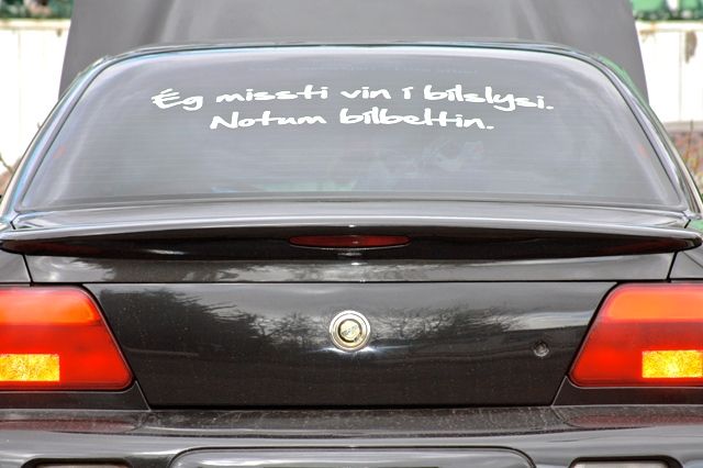Hilmar ákvað því að taka skrefið lengra og hannaði límmiða til þess að líma í afturrúðu bílsins. Skilaboðin eru sterk, enda persónuleg orðsending til ökumannsins fyrir aftan bifreiðina. Þar stendur einfaldlega: „Ég missti vin í bílslysi. Notum bílbeltin.“