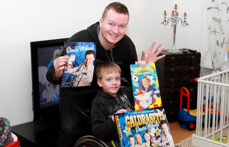 Í dag bankaði síðan töframaðurinn uppá heima hjá Alex Erni sem varð heldur betur steinhissa – og ánægður með heimsóknina. Einar Mikael brá á leik fyrir Alex og fleiri krakka úr hverfinu, sýndi og kenndi töfrabrögð og gaf Alex áritað veggspjald, galdrasett og galdrabók.