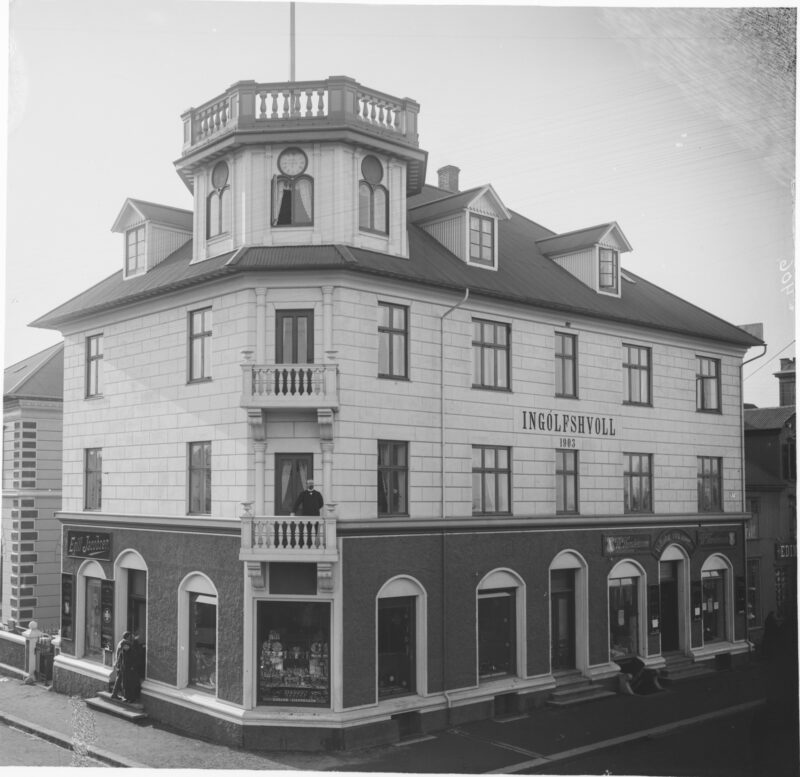 Reist á mótum Austurstrætis, Pósthússtrætis og Austurvallar rétt eftir 1900. Vöruhús á þremur hæðum, fyrsta stórverslun landsins þar sem Einar Benediktsson skáld hafði tögl og haldir. Húsið brann 1915.