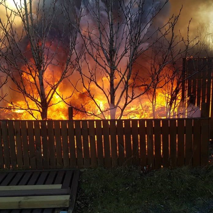 Eldurinn kviknaði í húsbíl og pallavirki sem byggt hafði verið í kringum hann.