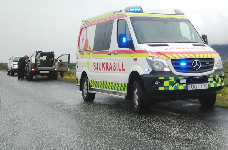 Ekki var slökkvitæki í bílnum en vegfarandi á öðrum bíl brást skjótt við og slökkti eldinn með slökkvitæki úr sinni bifreið.