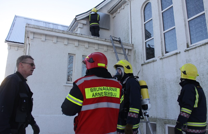 Slökkviliðsmenn við vinnu á kirkjuloftinu en eins og sést er talsverður reykur í kirkjunni. sunnlenska.is/Guðmundur Karl
