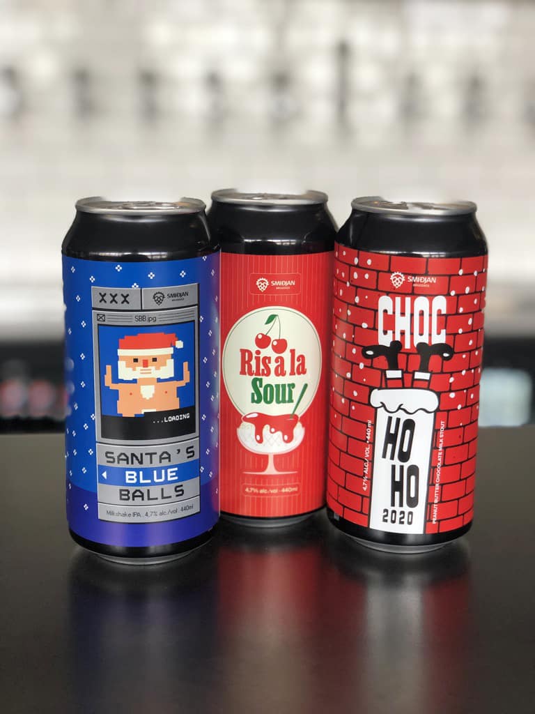 Sem fyrr segir er Smiðjan með þrjá jólabjóra í ár. Choc Ho Ho er milkstout með hnetusmjörs og súkkulaðibragði og ætti að henta vel með jólakonfektinu eða desertinum, Santa´s Blue Balls er bláberja og vanillu milkshake pale ale með helling af bláberjum og Ris a la Sour er súrbjór af stílnum Gose en hann er ketilsýrður með sunnlensku skyri, og inniheldur hann meðal annars kirsuber og smá af vanillukeim og ætti því að henta einstaklega vel með jólagrautnum og jafnvel út á hann.