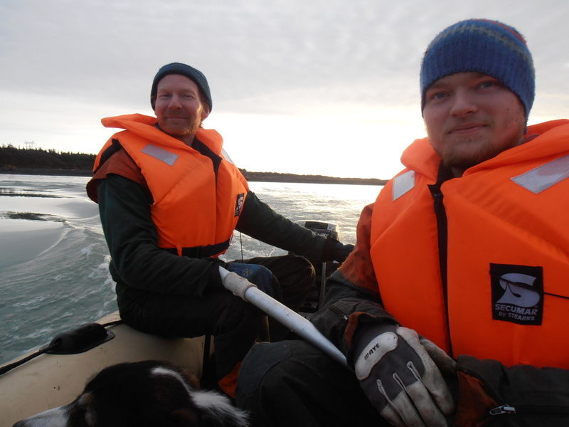 Þessa dagana er unnið að grisjun stafafuru í Skarfanesi á Landi og því sigla starfsmenn Skógræktar ríkisins yfir Þjórsá á leiðinni í vinnuna.